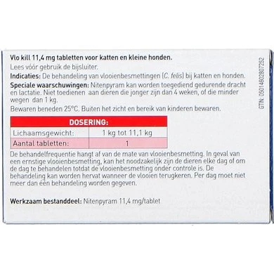 Doodt snel vlooien Vlo Kill+: dit product heeft de meest snelle werking in het doden van vlooien op uw huisdier. Binnen een kwartier vallen de eerste vlooien van uw hond en kat en na 6 uur zijn alle, op het dier aanwezige, vlooien dood. Vlokill+ is combineren met alle andere vlooienproducten. Het is tevens geschikt in de strijd tegen vlooien bij pups en kittens . De effecten op de vlooien (Ctenocephalides felis) kunnen worden waargenomen vanaf 15 30 minuten na toediening van het product aan de gastheer.