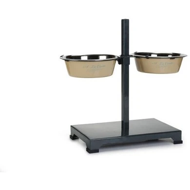 De Beeztees H-Standaard A la Carte is een mooie standaard met een voer- en drinkbak voor jouw hond. Deze standaard is in hoogte verstelbaar, zodat je zelf kan bepalen wat een fijne hoogte is voor jouw hond om te eten. De onderzijde van deze H-standaard is net even dan normale standaarden, waardoor het een unieke uitstraling krijgt. Bovendien bevat de onderkant dopjes, die dienen als antislip en deze zorgen er ook voor dat er geen krassen op de vloer komen. De naam A la Carte komt ook terug op de voer-en drinkbak. – Gemaakt van metaal – Antislip Afmeting: diameter bak 25 cm
