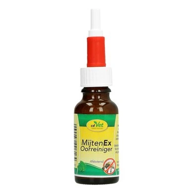 MijtenEx Oorreiniger is een compositie van etherische oliën ter afweer en ter reiniging en verzorging van geïrriteerde en gevoelige buitenste gehoorgangen bij honden, katten en andere huisdieren.
