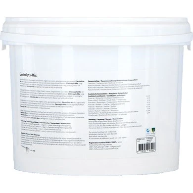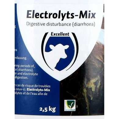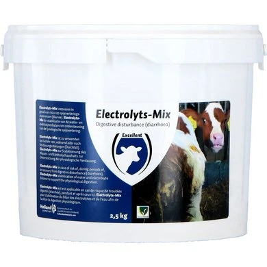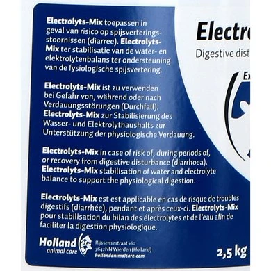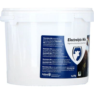 Electrolyts-Mix is een hoogwaardige elektrolyten-mix voor aanvulling van zouten bij vochtverlies. Electrolyts-Mix zorgt voor een goede opname van vocht om uitdroging te voorkomen. Voldoende vocht is erg belangrijk voor het verteringsproces. Electrolyts-Mix lost goed op in het water en blijft in oplossing.