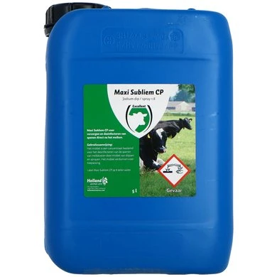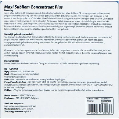 Maxi Subliem wordt geleverd als concentraat en moet voor het gebruik worden verdund om een eindconcentratie van jood van 0,3% te krijgen. Het product moet worden verdund tot 11% (110 mL product, water toevoegen tot 1 L). Niet meer vloeistof aanmaken dan nodig. Ga uit van 5 ml product per koe en per behandeling. Het gebruik van een doseerpomp voor het vullen van de spuitapparatuur met het product wordt aanbevolen. Maak tijdens de verdunningsstap gebruik van handschoenen en oogbescherming. Het verdunde product kan gedurende 1 week worden bewaard en gebruikt. Het product moet voor gebruik op een temperatuur hoger dan 20 °C worden gebracht.