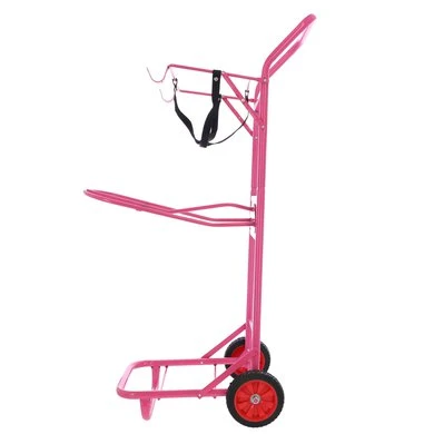 Deze stalkruier is ideaal om uw zadel, hoofdstel en poetsspullen tot vlakbij het paard te rijden. Geen gesleep meer met dat zware zadel! U rijdt de stalkruier zo de zadelkamer in en hoeft de spullen er in principe niet eens af te halen, de kruier blijft stevig staan met een zadel erop! Plaats voor zadel, hoofdstel, halster etc. Er is plaats voor een poetsbox of poetstas in de bovenste houder.In de onderste houder is nog ruimte voor een open poetsbak. Indien je liever meer ruimte wilt voor je zadel, kun je de bovenste poetskisthouder (ook tijdelijk) eenvoudig verwijderen. 127 (hoogte)*77 (breedte)*48cm (lengte) Gepoedercoat frame (mat zwart). Afmetingen voor de poestkoffer 22.5*38cm
