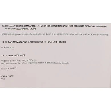 Tenzij anders voorgeschreven, ’s morgens en ’s avonds, indien nodig vaker, op de betrokken plekken aanbrengen, eventueel onder verband.