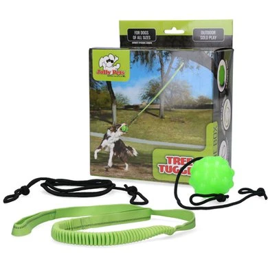 Gooi het elastiek over een boomtak en kijk hoe je hond zich urenlang vermaakt met springen, slingeren en trekken aan de bal.