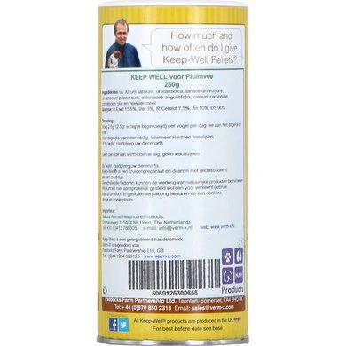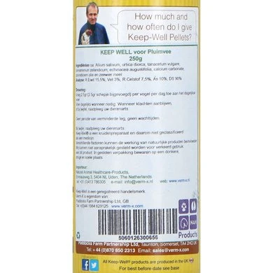 Voeg 2,5 gram Keep-Well korrels per vogel per dag toe aan het voer. Voer indien nodig dagelijks. Een maatschepje wordt bij iedere verpakking bijgeleverd.