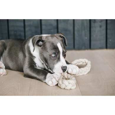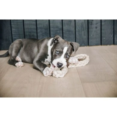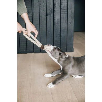 Dit hondenspeeltje zal voor uren plezier zorgen voor uw hond! Het is vervaardigd uit een stevige katoenen koord en gemaakt om samen met uw hond te spelen door aan één kant te trekken. We gebruikten katoen met het GOTS-certificaat. Dat wil zeggen dat de gebruikte vezels ecologisch en fairtrade zijn. We voegden een klein suède stukje toe om het 8 lussen te geven. -Stevig koordspeeltje-Natuurlijk materiaal -100% GOTS-certificaat katoen