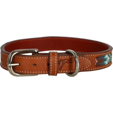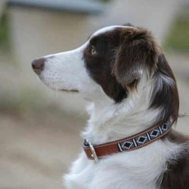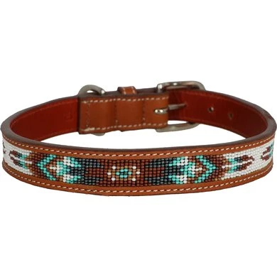 De Pearl hondenhalsband is van leer met inzetstukken bekleed met kralen. De patronen variëren afhankelijk van de kleur van het leer. Samenstelling: rundleer, roestvrijstalen gespen en ringen.