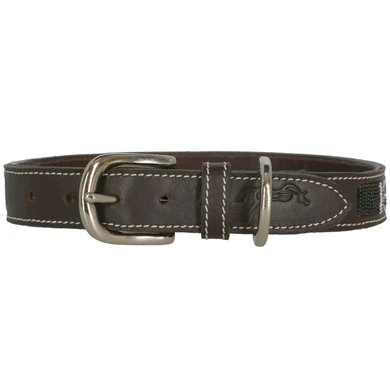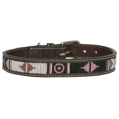 De Pearl hondenhalsband is van leer met inzetstukken bekleed met kralen. De patronen variëren afhankelijk van de kleur van het leer. Samenstelling: rundleer, roestvrijstalen gespen en ringen.