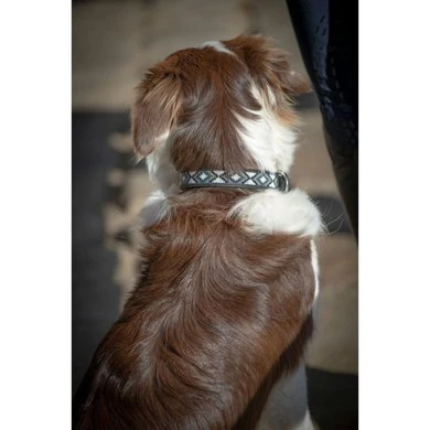 De Pearl hondenhalsband is van leer met inzetstukken bekleed met kralen. De patronen variëren afhankelijk van de kleur van het leer. Samenstelling: rundleer, roestvrijstalen gespen en ringen.