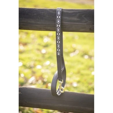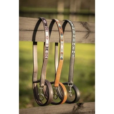 Gemaakt van leer, met een contrasterende crème zadelsteek en een inzet van veelkleurige parels die veranderen met de kleur van het leer. Het heeft een handvat voor een betere grip en een zilveren karabijnhaak voor het gemakkelijk vastmaken of losmaken van een halsband.