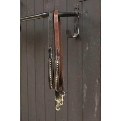 De Penelope “Rubber” hondenriem heeft een met zacht leer gevoerd handvat met een lakafwerking en een contrasterende crème zadelsteek. Het heeft ook een zacht rubberen deel met spikes dat lijkt op het uiterlijk van hoofdstelteugels.