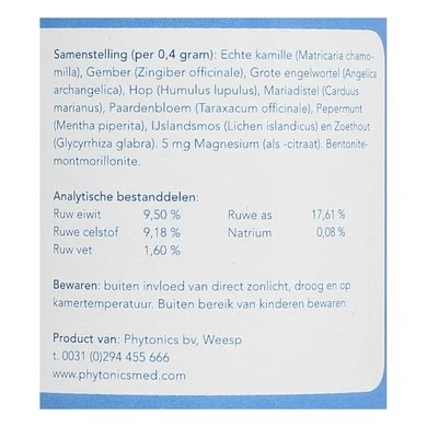 Angelica archangelica, Carduus marianus, Chamomilla recutita, Glycyrrhiza glabra, Humulus lupulus, Lichen islandicus, Mentha piperita, Taraxacum officinale, Zingiber. Magnesiumcitraat, Montmorilloniet.