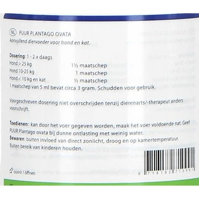 Gebruik: Geef Plantago Ovata door het voer en maak het voer voldoende nat. Bij dunne ontlasting toedienen met weinig water. Het gebruik van Plantago Ovata bij voorkeur intermitterend inzetten: Na ongeveer 10 dagen gebruik, neemt de werking van Psyllium af. Na macimaal 10 dagen gebruik, minimaal 2 weken stoppen voordat Psyllium opnieuw wordt ingezet. Bij langdurig ongemak is het effect meestal zichtbaar na 1 tot 3 dagen.