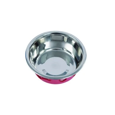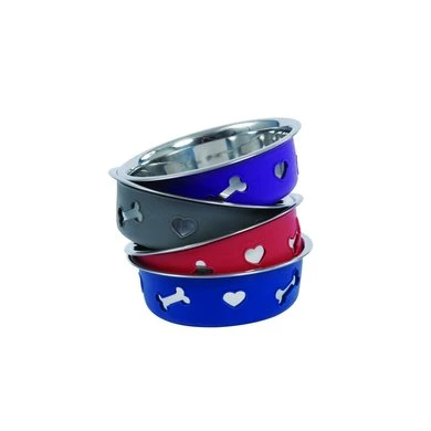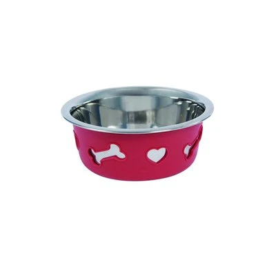 Roestvrijstalen hondenkom met een verwijderbare siliconen buitenkant. De siliconen buitenkant van het botpatroon kan worden verwijderd voor reiniging en helpt lawaai en slippen te verminderen.