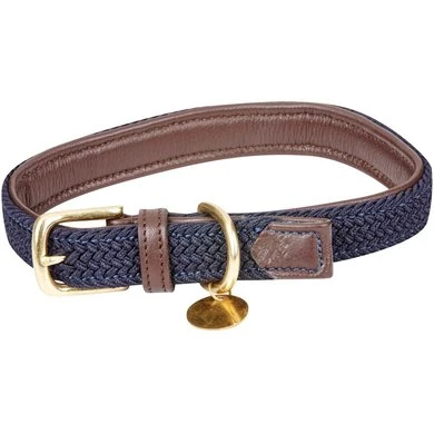 Gevoerde leren hondenhalsband met zachte gevlochten katoenen details aan de buitenkant. Massief messing beslag met naamplaatje. Zachte, natuurlijk gefreesde leren vulling om uw hond comfortabel te houden. Bijpassend snoer verkrijgbaar.